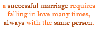 i think that the bottom line is: marriage isn't easy. it has realms and voids and capacities beyond any other human interaction. couple that with the daily stress that we all incur and hang on… if you can… very tight. and in my use of the term marriage i would like it to be known that i include not currently legal domestic partnerships and even live in relationships. human interaction on this amazingly and almost species exclusive magnitude is a tremendous accomplishment of civilized culture, which we all know is contrary to our animal needs and desires.